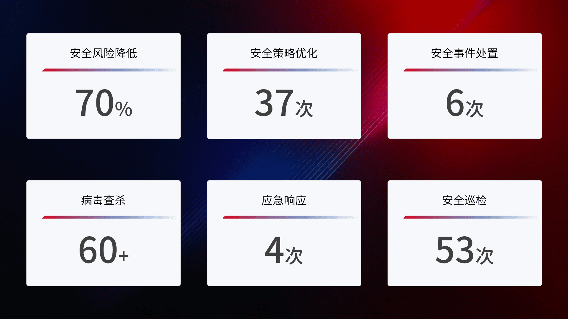 提供全面的安全事件报告体系,,,包括处置报告、、、周报、、、、季度和年度总结,,结合持续监控,,帮助客户深入了解网络安全状况。。。。