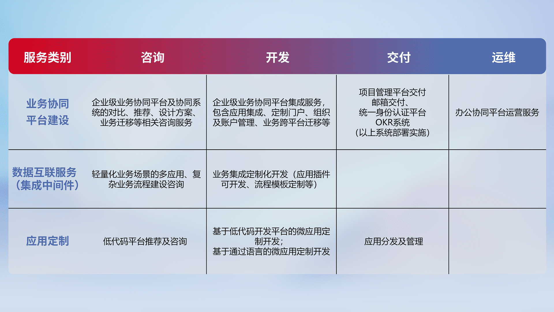 针对钉钉、、、、企微、、、IDaas等平台级产品提供产品的规划、、、方案、、、、交付、、、、定制化开发等服务,,,实现如统一协同办公、、智能客户服务、、、、混合会议管理、、、智能数据查询、、、等业务场景,,,,实现数字化转型。。。